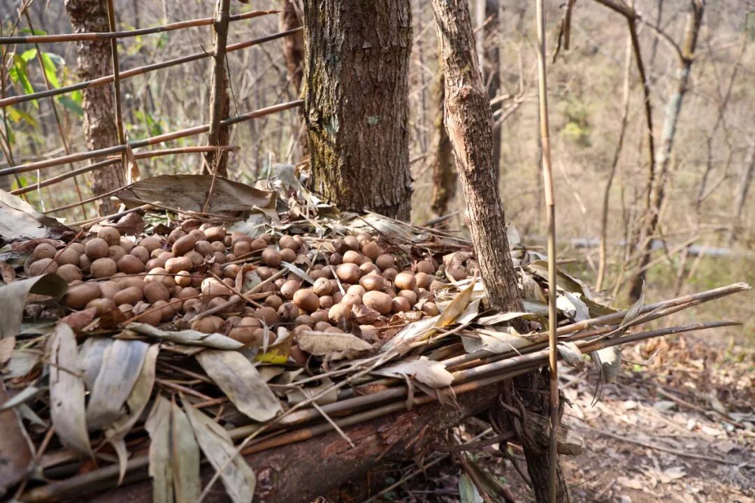 几十秒的沉寂之后,树林里远远传来一声回应。循着声音走去,一个灰头土脸的人正坐在土坡上。过了十来分钟,旁边的树丛也传来说话声,然后是第三个、第四个声音,有人带着挖到的山药从中间的土路上走过,有人在水源处接水洗手,越来越多的白烟,从不同的山坡飘起来。