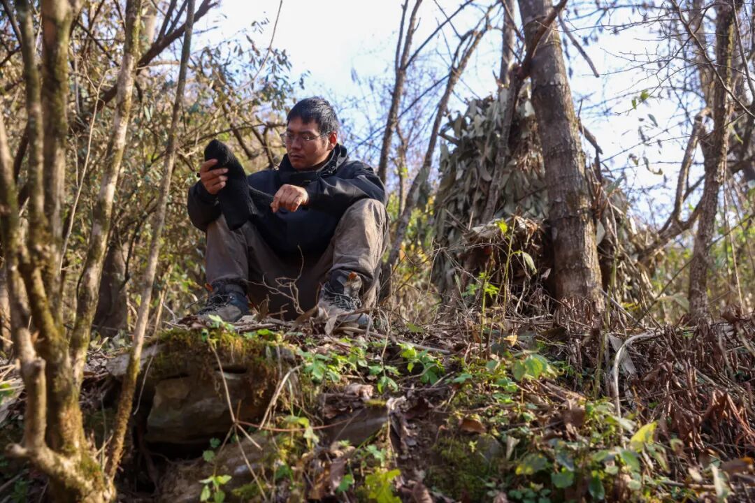 11月11日,锦屏文旅终于来到张家界七星山。苗王并不知情,他照常出门打野,回到庇护所的时候,安全员告诉他,别出门了,待会儿有人来找你。等了一会儿,几个人带着摄像设备过来了,他们说的是锦屏方言:“加(xia)油,拿到奖(xiang)金(xin)!”苗王一下就感到亲切,这是家里面来人了。