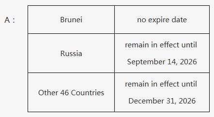 目前,中方对文莱持普通护照人员的免签政策未设施行期限,对俄罗斯持普通护照人员的免签政策施行至2026年9月14日魔投网,对其余46国持普通护照人员的免签政策施行至2026年12月31日。