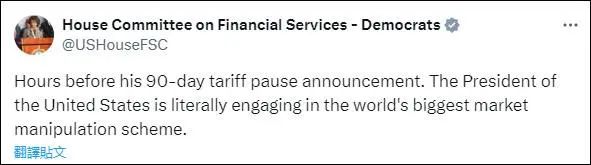 “美国总统实际上参与了世界上最大的市场操纵计划。”众议院金融服务委员会的民主党人在社交平台账号写道。